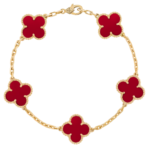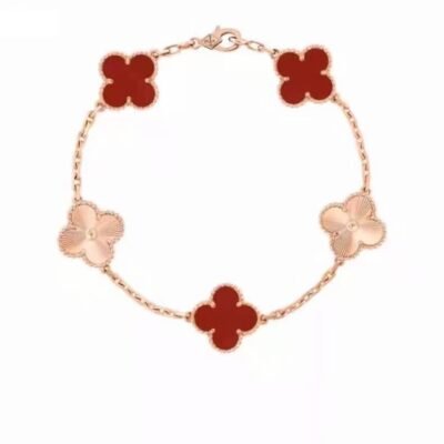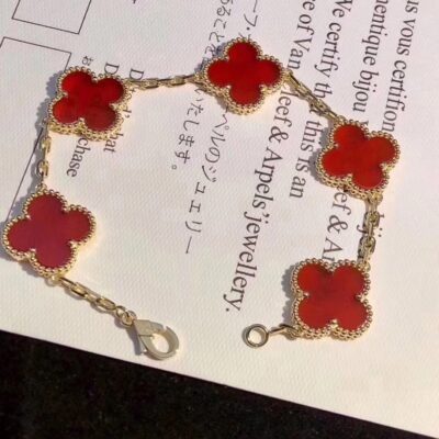 $30.33 – $35.33Price range: $30.33 through $35.33Clover bracelet Vintage Alhambra bracelet, 5 motifs Carnelian mix Yellow gold
