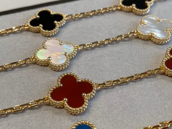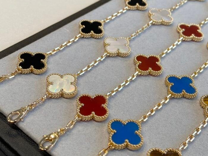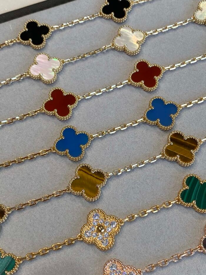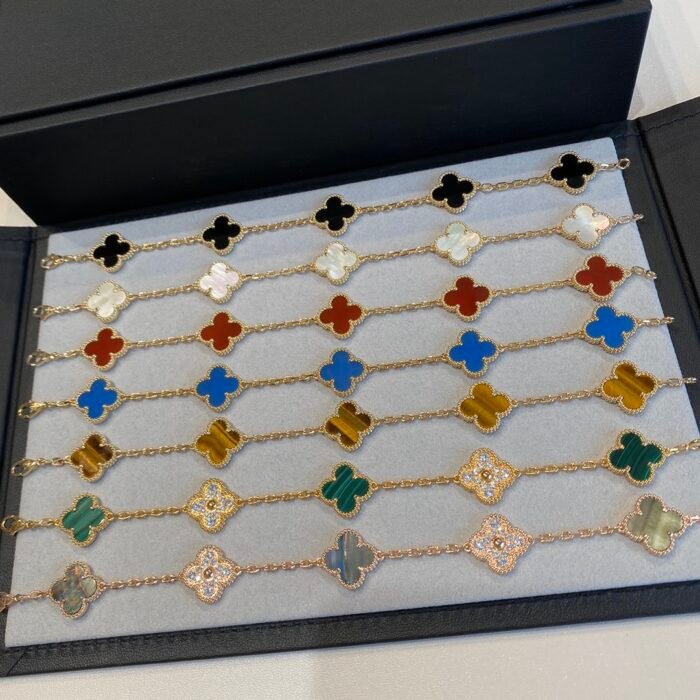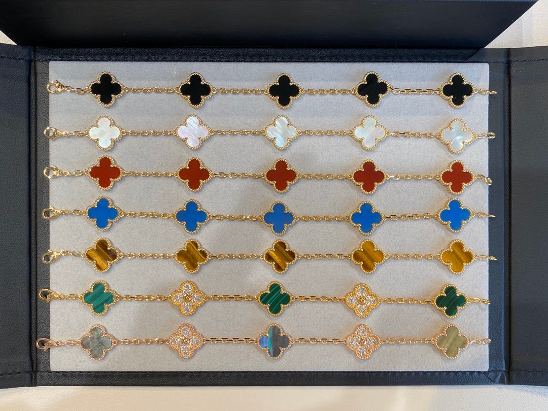 VCA vintage Alhambra four-leaf clover laser flash gold carnelian five-flower bracelet has arrived👄Authentic purchase level, high version, high color retention, long-lasting workmanship, complex details, exquisite originality😍The unique design makes people fall in love at first sight, Original top quality diamond-shaped original buckle, exclusive real shot! ! If you like the style, please feel free to contact us, We also have necklace, earrings and rings.