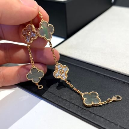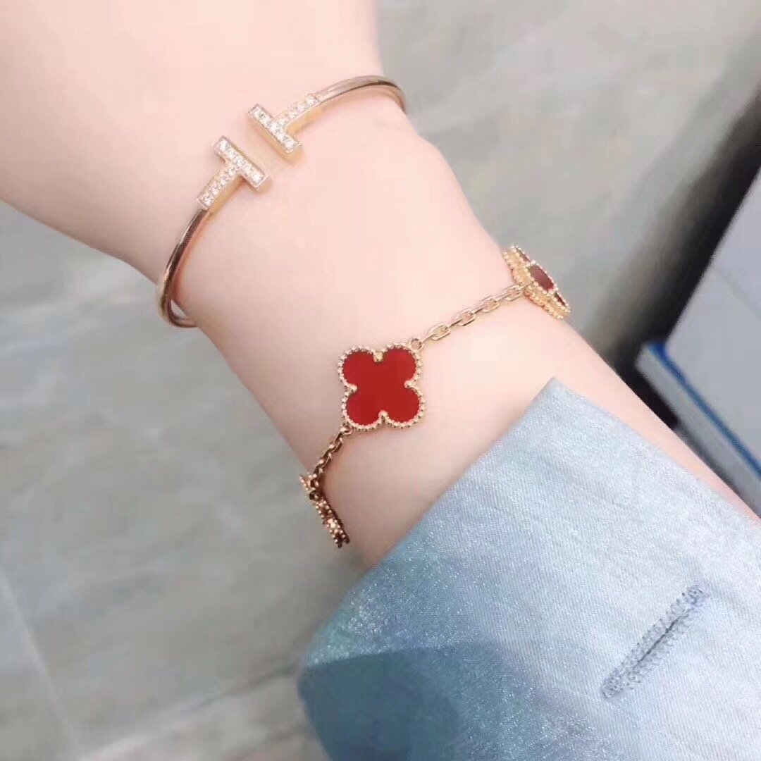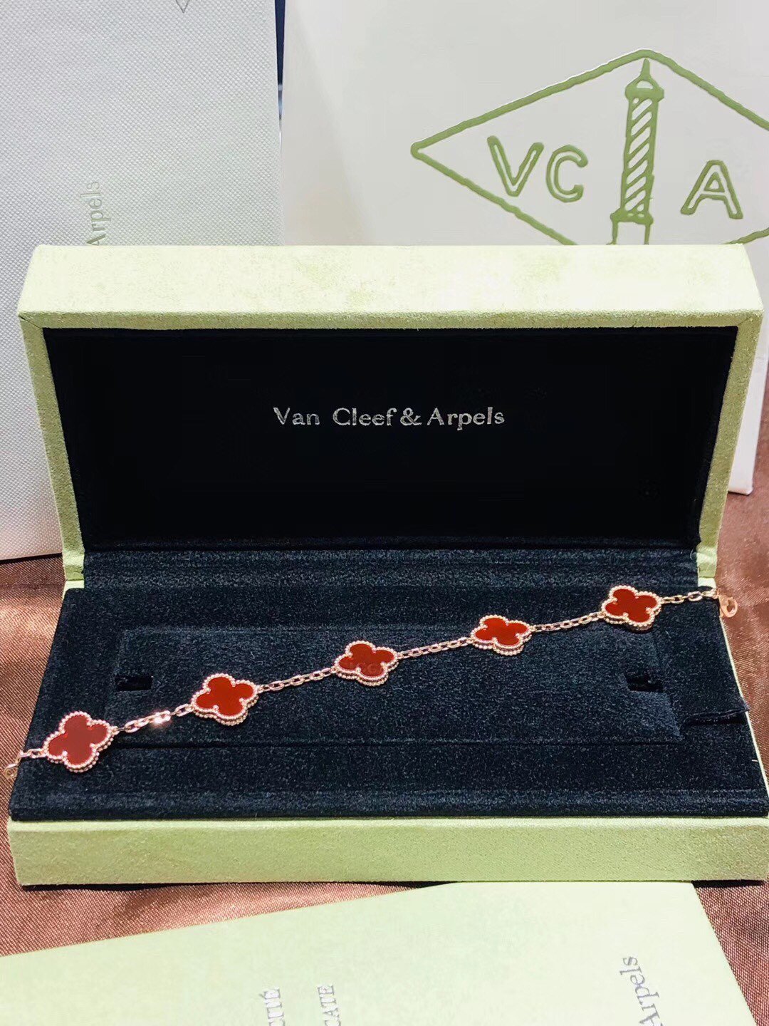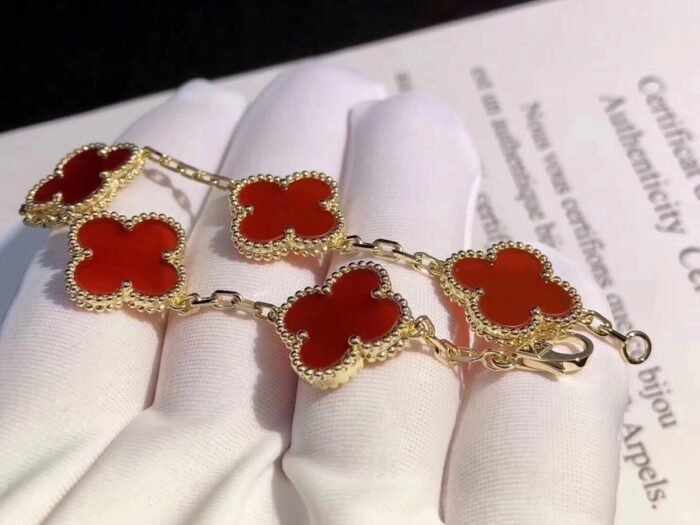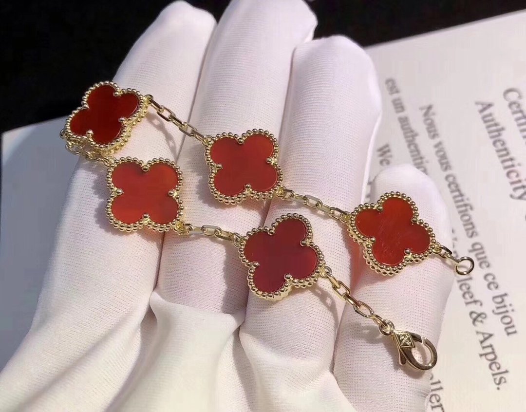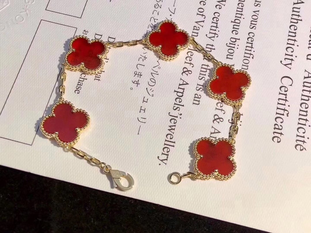 VCA vintage Alhambra four-leaf clover laser flash gold carnelian five-flower bracelet has arrived👄Authentic purchase level, high version, high color retention, long-lasting workmanship, complex details, exquisite originality😍The unique design makes people fall in love at first sight, Original top quality diamond-shaped original buckle, exclusive real shot! ! If you like the style, please feel free to contact us, We also have necklace, earrings and rings.