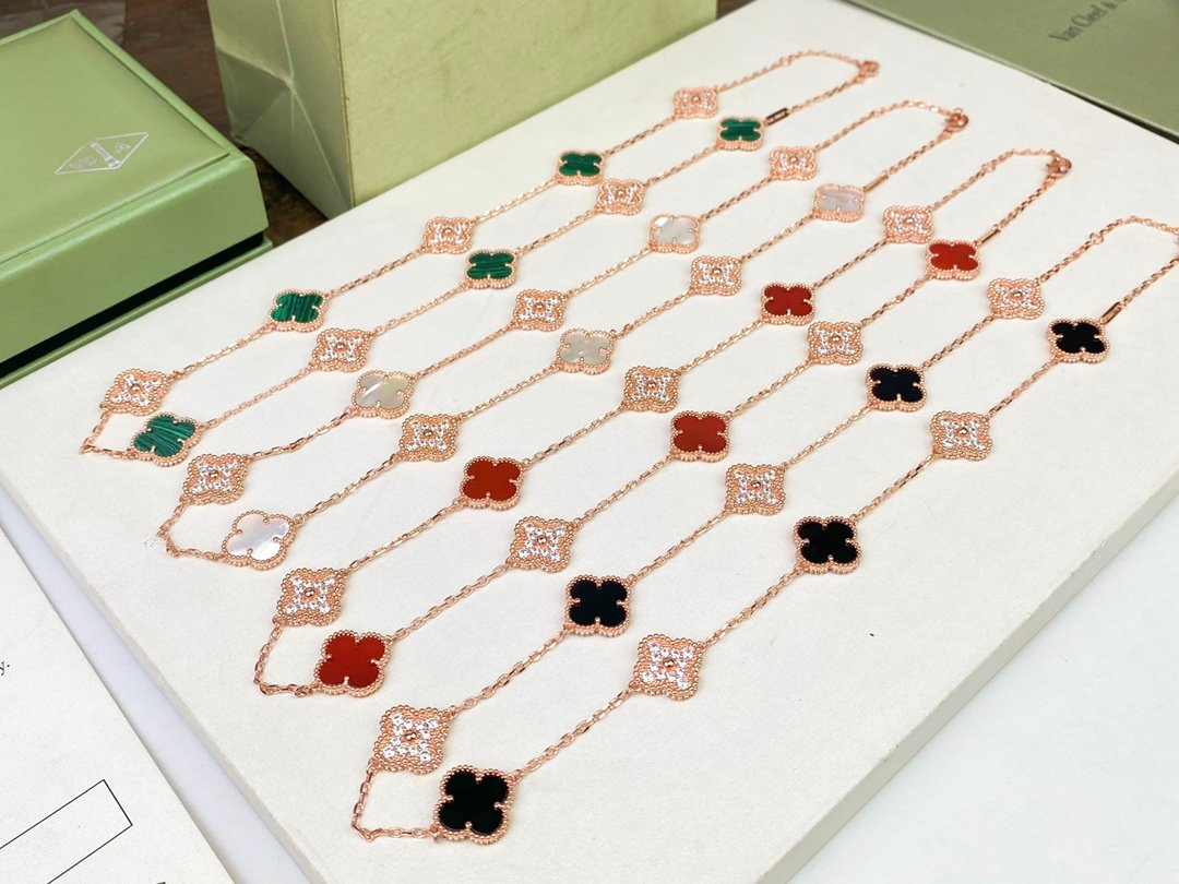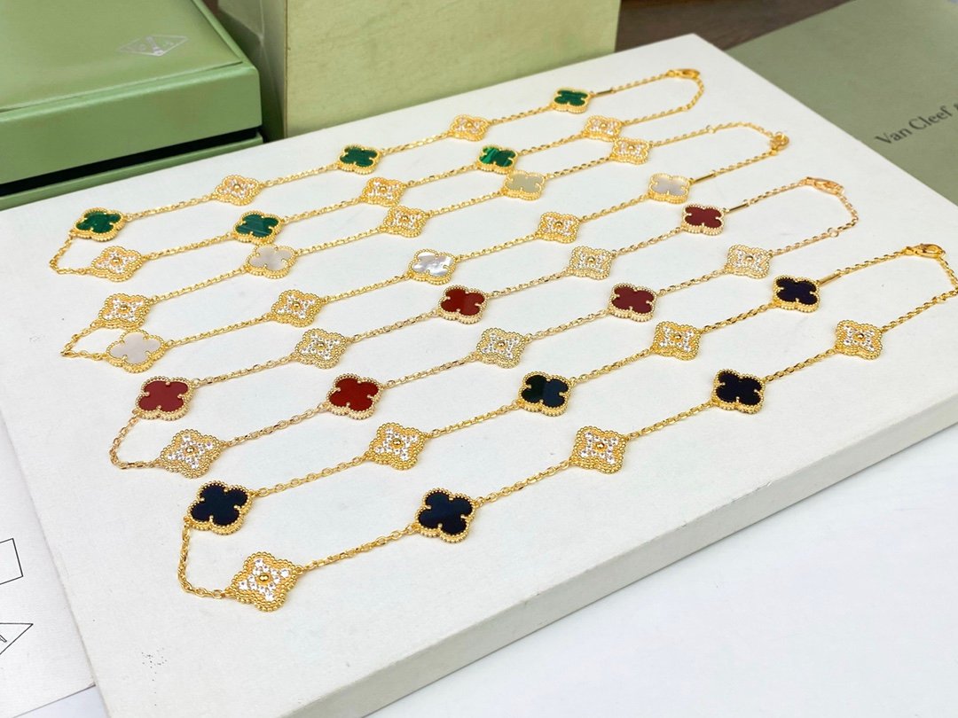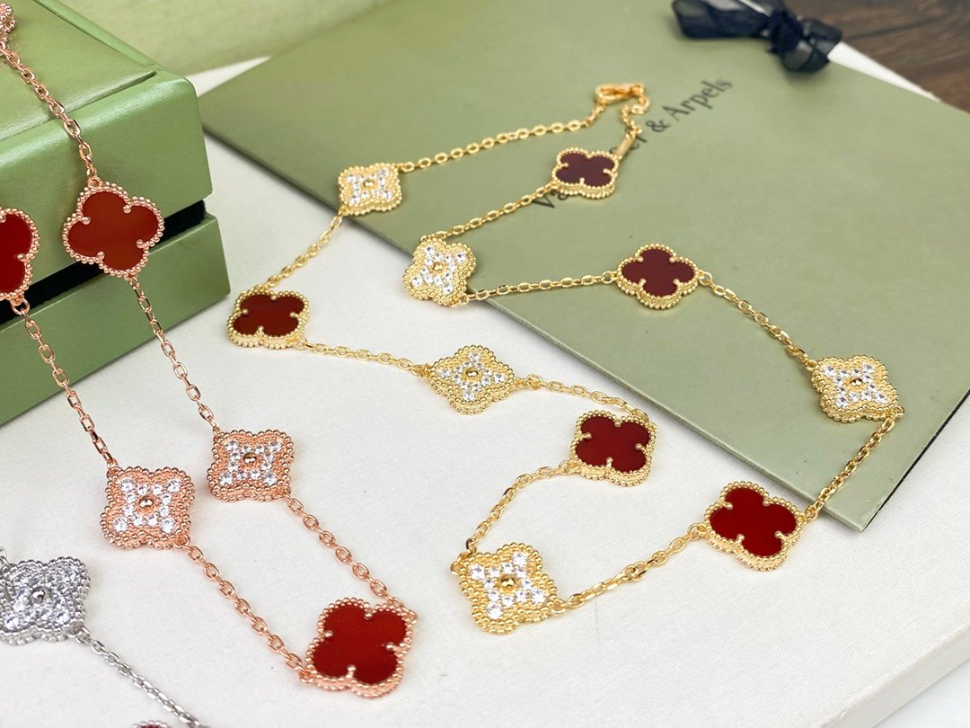 VCA vintage Alhambra four-leaf clover laser flash gold carnelian five-flower Necklace has arrived👄Authentic purchase level, high version, high color retention, long-lasting workmanship, complex details, exquisite originality😍The unique design makes people fall in love at first sight, Original top quality diamond-shaped original buckle, exclusive real shot! ! If you like the style, please feel free to contact us, We also have bracelet, necklace, earrings and rings.