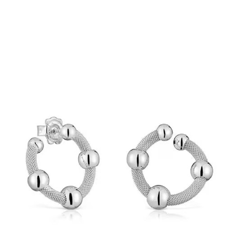 Silver TOUS Icon Mesh sterling silver hoop earrings with five details on the hoop. Pressure clasp.